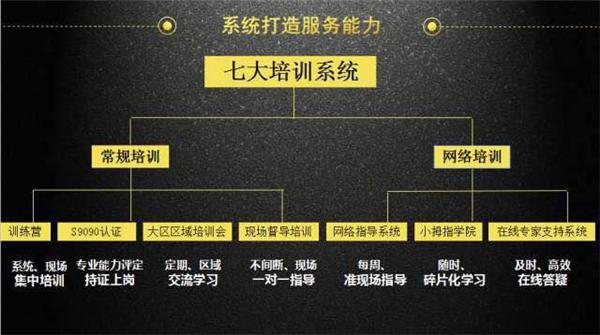 据了解,小拇指汽修连锁为了提升汽修连锁加盟整体服务水平,通过实践和创新,建立有业界领先的加盟支持平台,除了营运督导体系之外,还有七大培养体系。其中包括“小拇指特训营”、“S9090认证”、“大区区域培训会”、“现场督导培训”等,实现线上、线下全网络覆盖的同时,还有行业首创的S9090认证体系用户考核和评判人才培训成果,为汽修行业输出源源不断的高素质人才。
