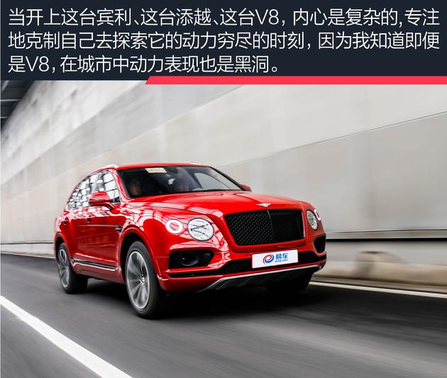 易车抢先试驾 首先这是一台宾利,世界上少有的几个顶级豪华品牌之一;这是一台添越,在Cullinan问世前最豪华的SUV;其次这是在国内首次体验V8车型,虽然相比W12少了四缸,但是依旧霸气十足。